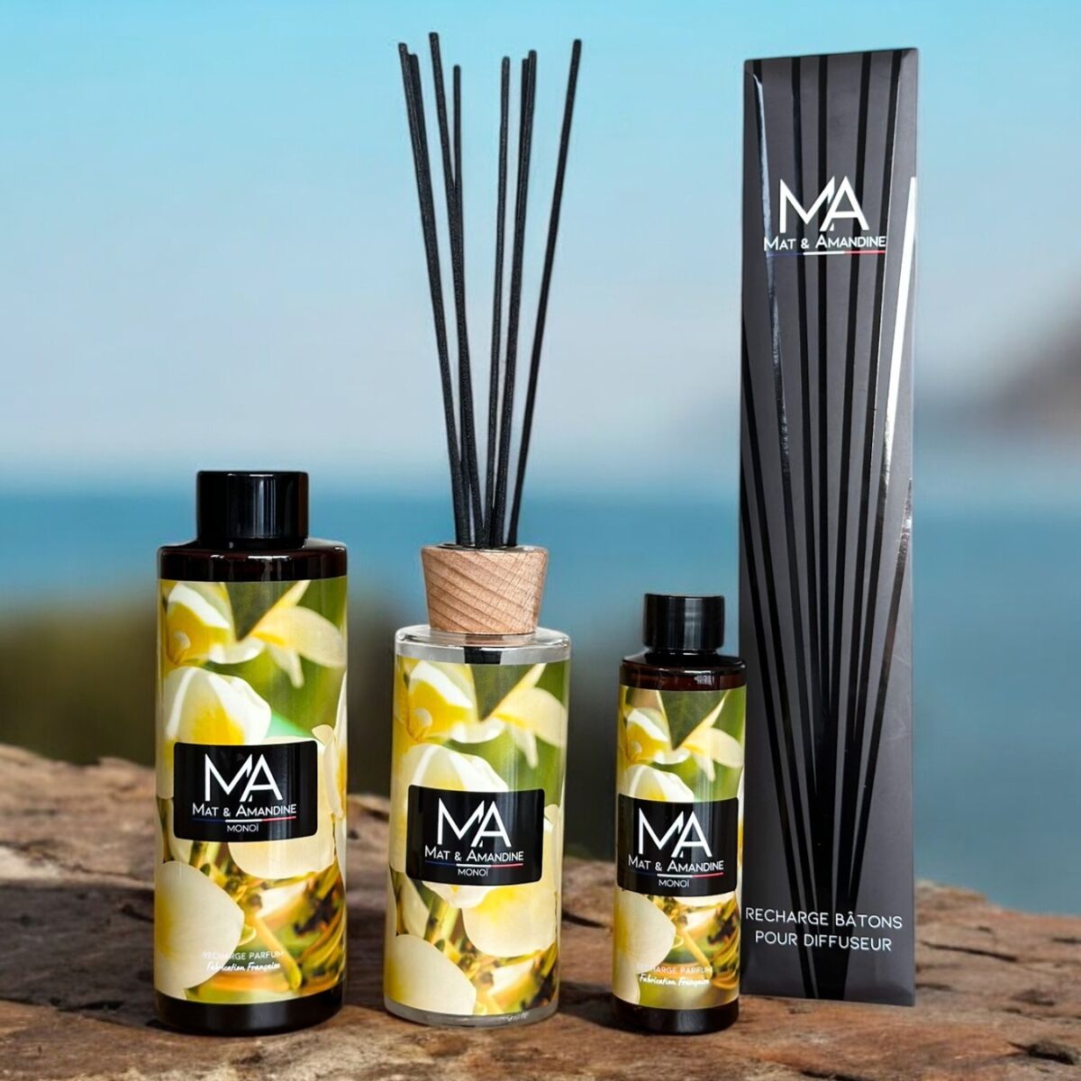 Découvrez une expérience olfactive exceptionnelle avec notre diffuseur à bâtons Monoï, un équilibre parfait entre l’esthétique et le parfum. Conçu pour parfumer subtilement votre espace, ce diffuseur combine l’art du design avec l’efficacité d’une diffusion constante. Les bâtons plongés dans notre précieux mélange parfumé agissent comme des conducteurs magiques, absorbant et libérant lentement des notes envoûtantes qui dans l’air. Chaque pièce devient ainsi un tableau olfactif, une symphonie subtile qui éveille les sens et crée une atmosphère chaleureuse et enveloppante. Avec notre diffuseur à bâtons Monoï, offrez-vous le luxe d’une maison imprégnée de parfums délicats.