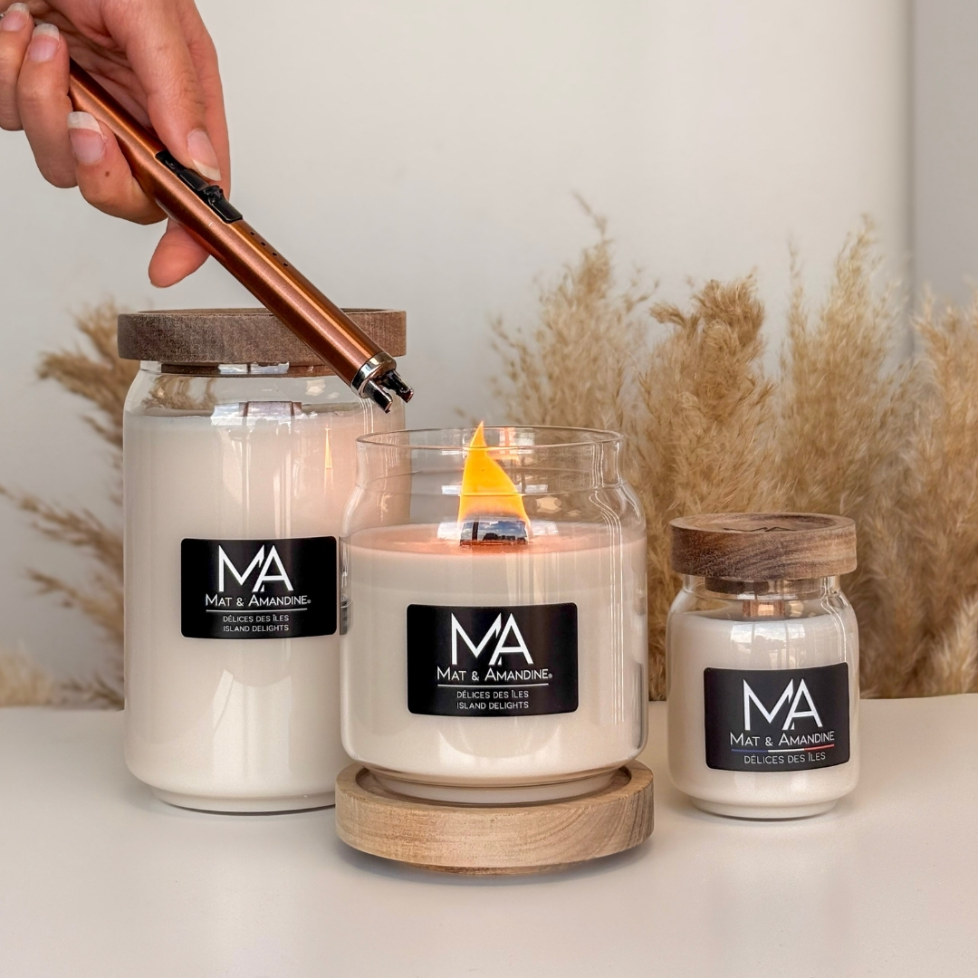 - Allumez la Bougie Parfumée Gourmande à l’aide d’un briquet Mat & Amandine.